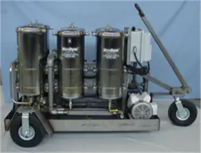 Oil exits the vacuum chamber through the outlet pump, which returns the oil to the equipment at a consistent system flow rate and discharge pressure. The oil then passes through a cartridge filter assembly that removes particulates down to 0.5 microns.